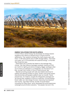 In South Africa, Zonke Energy has developed an energy solution targeted at the millions of people living in off-grid informal settlements. Their systems comprise five-metre towers each with three 1.5 kW solar panels and a 5 kWh storage battery. ‘One tower can power up to 16 households with essential energy,’ co-founder Alex Densmore says.