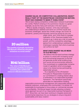responsible environmental management and responsible behaviour towards customers, employees and communities. It is simply not sustainable for businesses to focus solely on commercial success and profitability. Old Mutual began formally adopting a shared- value approach as part of our responsible business framework in 2017. Since then, we have been working to integrate social and environmental objectives into our strategies to ensure long-term sustainability and value creation.’