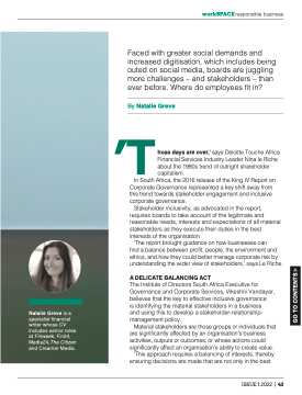 Stakeholder inclusivity, as advocated in the report, requires boards to take account of the legitimate and reasonable needs, interests and expectations of all material stakeholders as they execute their duties in the best interests of the organisation.