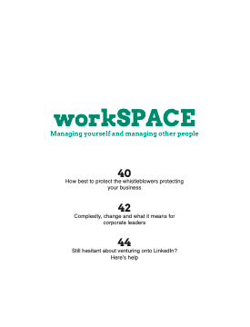 workSPACE Managing yourself and managing other people 40 How best to protect the whistleblowers protecting your business 42 Complexity, change and what it means for corporate leaders 44 Still hesitant about venturing onto LinkedIn? Here’s help