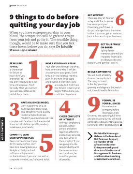 When you have entrepreneurship in your blood, the temptation will be great to resign from your job and go for it. The sensible thing, though, would be to make sure that you tick these boxes before you do, says Dr Jabulile Msimango-Galawe.