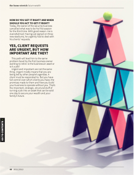 Urgent and important are not the same thing. Urgent mostly means that you are being led by other people’s agendas. A client must be responded to. But you have full control over which clients you have, the promises made to them and how you build your business to operate without you. That’s the important, strategic, structural stuff of turning a job into an asset that can be sold one day to secure your wealth and your family’s future.