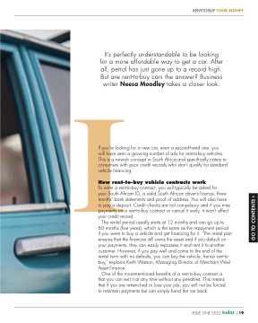 60 months (five years), which is the same as the repayment period if you were to buy a vehicle and get financing for it. ‘The rental part ensures that the financier still owns the asset and if you default on your payments, they can easily repossess it and rent it to another customer. However, if you pay well and come to the end of the rental term with no defaults, you can buy the vehicle, hence rent-to- buy,’ explains Keith Watson, Managing Director of Merchant West Asset Finance.