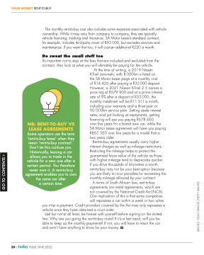 The monthly rent-to-buy cost also includes some expenses associated with vehicle ownership. While it may vary from company to company, they are typically vehicle licensing, tracking and insurance. SA Motor Lease’s standard contract,