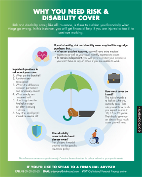 Risk and disability cover, like all insurance, is there to cushion you financially when things go wrong. In this instance, you will get financial help if you are injured or too ill to continue working.
