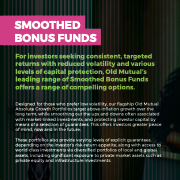SMOOTHED BONUS FUNDS For investors seeking consistent, targeted returns with reduced volatility and various levels of capital protection, Old Mutual’s leading range of Smoothed Bonus Funds offers a range of compelling options. Designed for those who prefer low volatility, our flagship Old Mutual Absolute Growth Portfolios target above-inflation growth over the long term, while smoothing out the ups and downs often associated with market-linked investments, and protecting investor capital by means of a selection of guarantees. This offers investors greater peace of mind, now and in the future. These portfolios also provide varying levels of explicit guarantees, depending on the investor’s risk-return appetite; along with access to world-class investments via diversified portfolios of local and global assets, including significant exposure to private market assets such as private equity and infrastructure investments.