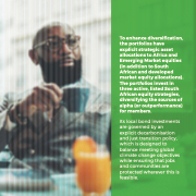 To enhance diversification, the portfolios have explicit strategic asset allocations to Africa and Emerging Market equities (in addition to South African and developed market equity allocations). The portfolios invest in three active, listed South African equity strategies, diversifying the sources of alpha (or outperformance) for members. Its local bond investments are governed by an explicit decarbonisation and just transition policy, which is designed to balance meeting global climate change objectives while ensuring that jobs and communities are protected wherever this is feasible.