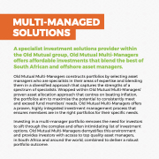 MULTI-MANAGED SOLUTIONS A specialist investment solutions provider within the Old Mutual group, Old Mutual Multi-Managers offers affordable investments that blend the best of South African and offshore asset managers. Old Mutual Multi-Managers constructs portfolios by selecting asset managers who are specialists in their areas of expertise and blending them in a diversified approach that captures the strengths of a spectrum of specialists. Wrapped within Old Mutual Multi-Managers’ proven asset allocation approach that centres on beating inflation, the portfolios aim to maximise the potential to consistently meet and exceed fund members’ needs. Old Mutual Multi-Managers offers a proven, highly integrated investment management process that ensures members are in the right portfolios for their specific needs. Investing in a multi-manager portfolio removes the need for investors to sift through the complex and often intimidating list of investment options. Old Mutual Multi-Managers demystifies this environment and provides investors with access to top quality asset managers, in South Africa and around the world, combined to deliver a robust portfolio outcome.